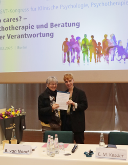 Am Samstag, 22. März wurde im Rahmen des 33. DGVT-Kongresses für Klinische Psychologie, Psychotherapie und Beratung an der Technischen Universität Berlin der DGVT-Preis an Prof. Eva-Marie Kessler verliehen. Monika Bormann, Mitglied des geschäftsführenden Vorstandes der DGVT, gratulierte der Preisträgerin herzlich zu dieser verdienten Auszeichnung und dankte ihr für ihren außerordentlichen Einsatz zur Verbesserung der psychotherapeutischen Versorgung älter Menschen mit psychischen Erkrankungen. Im Anschluss übernahm Prof. Dr. Simon Forstmeier die Laudatio für Prof. Dr. Eva-Marie Kessler. Er ist Inhaber der Professur für Entwicklungspsychologie und Klinische Psychologie der Lebensspanne an der Universität Siegen.